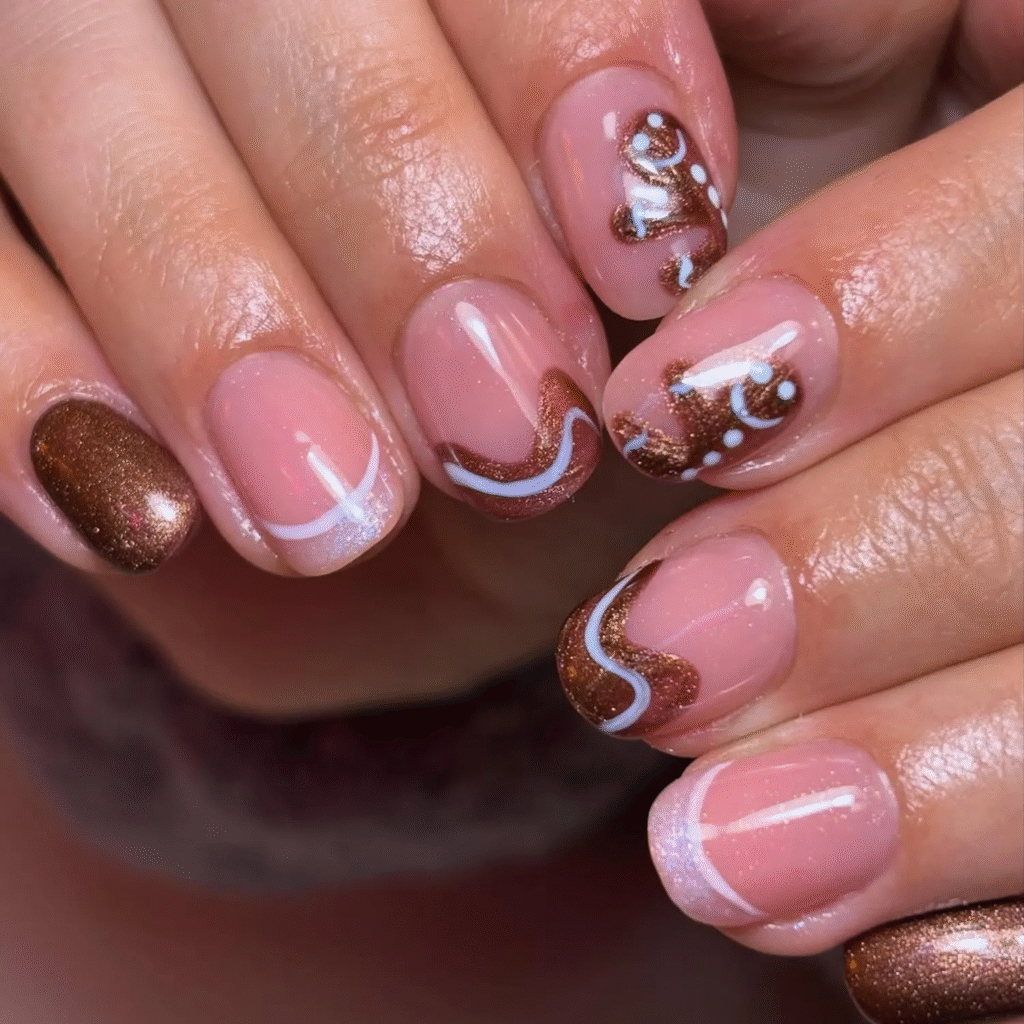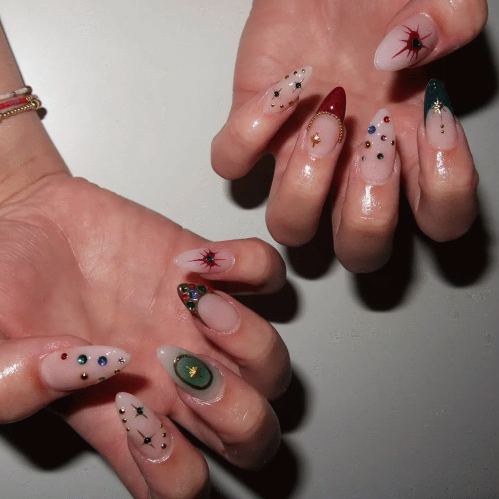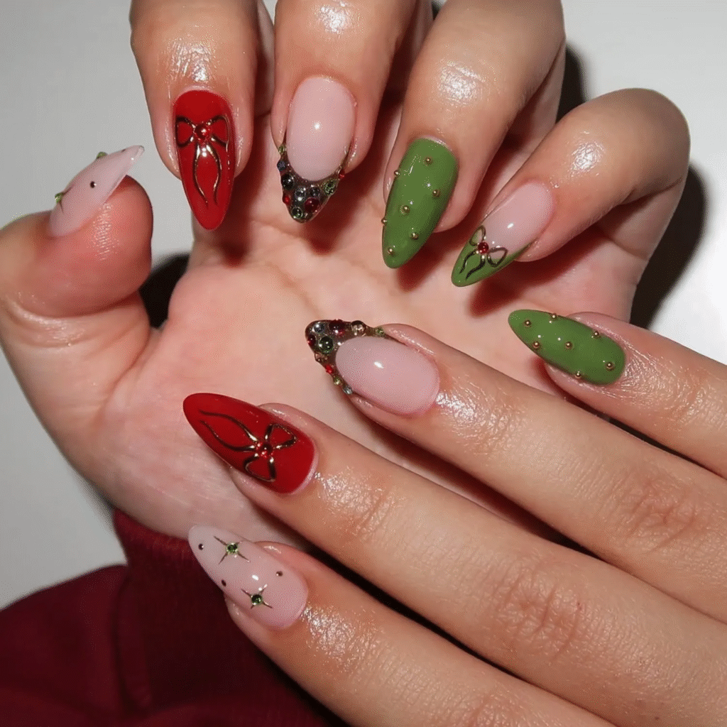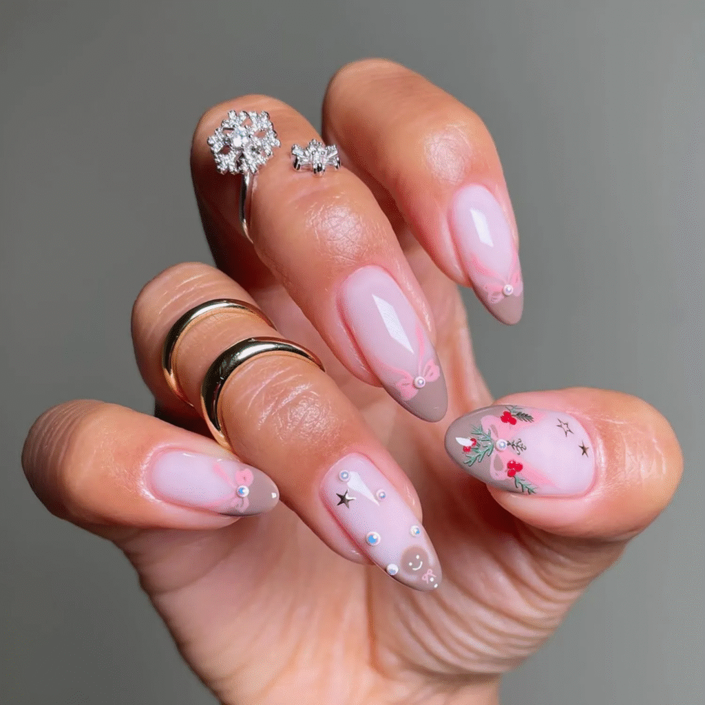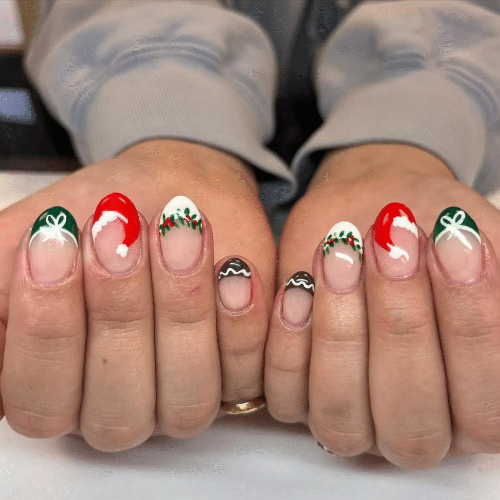 This design mixes red, pink, and cute Christmas art. It feels fun, bright, and great for anyone who loves playful nails.