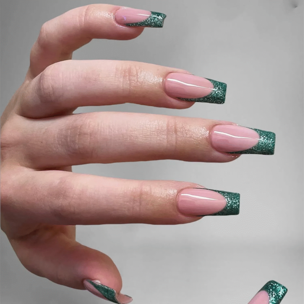 If you love sparkle, this one is for you. The square nails have bright green glitter tips that give a fun holiday vibe.