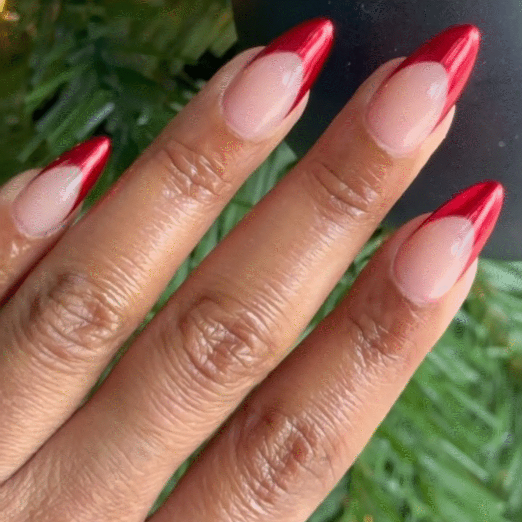 Red chrome tips make the nails look bold and festive. This design needs almost no effort but still looks very Christmas-ready.