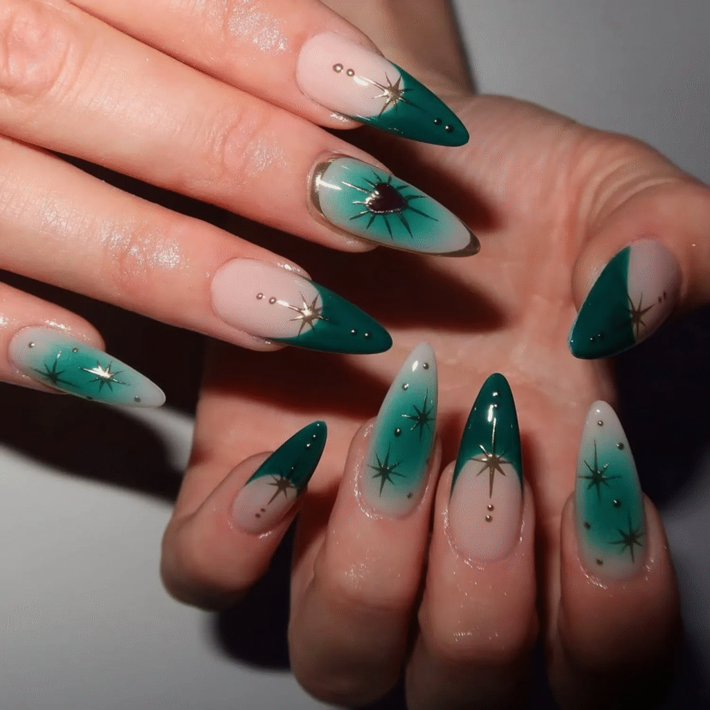 This look uses deep green tips instead of white ones. The design switches between French tips and aura nails. Gold chrome stars and borders make it shine for the holidays.