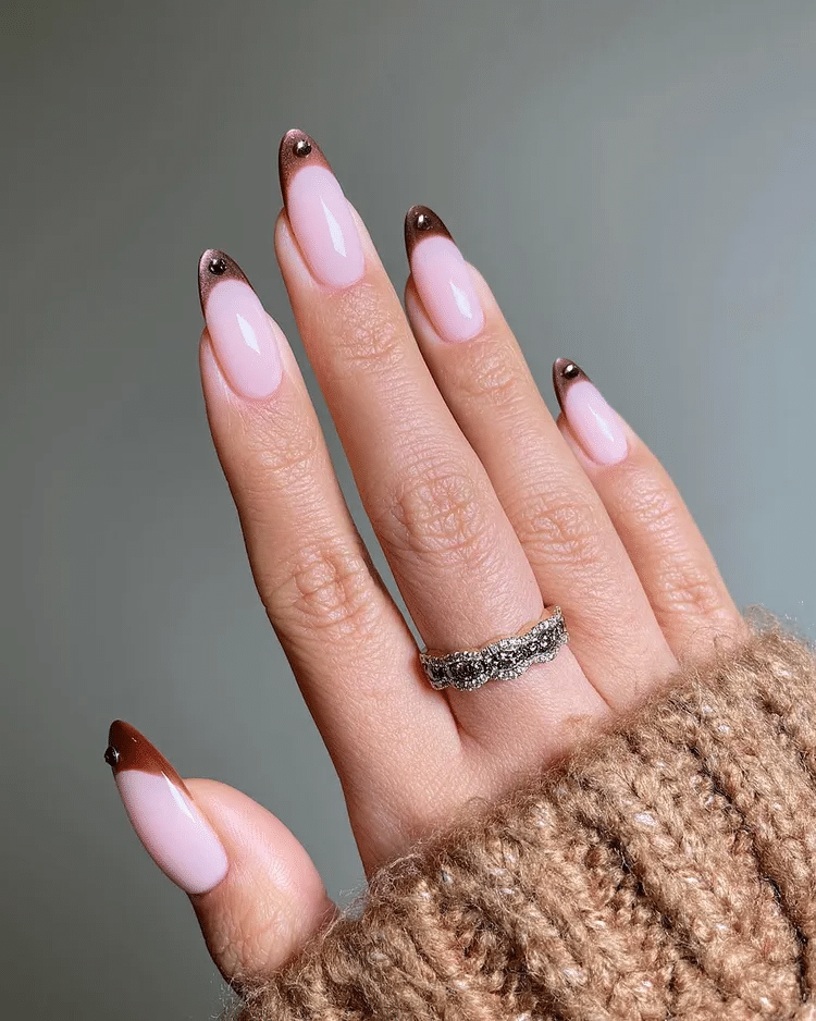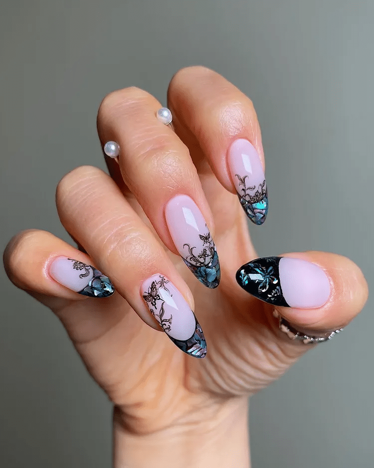 This style changes the classic French base. The nail base is blue and shiny, not nude. A soft amber tip adds warmth and balance.