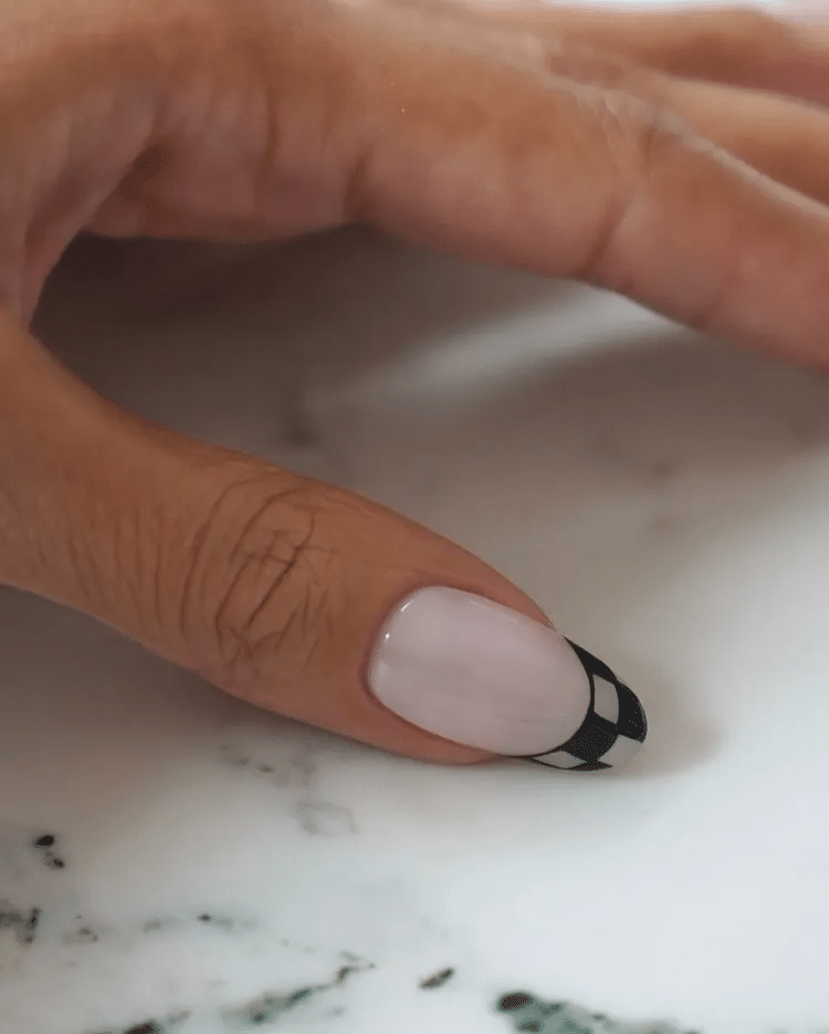 This design hides a small surprise. A checkerboard pattern sits inside the French tip. It looks simple until you look closer.
