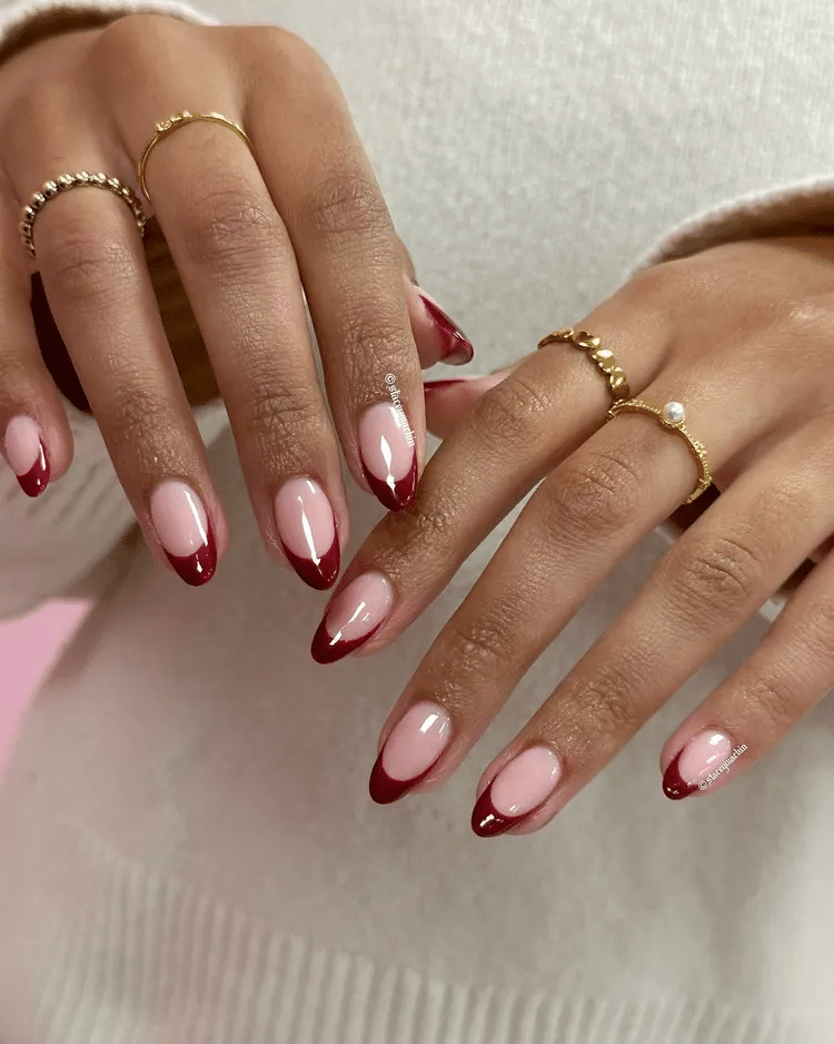 This is a simple twist on the classic look. The base stays nude and clean. The white tip is replaced with a bold red for drama.