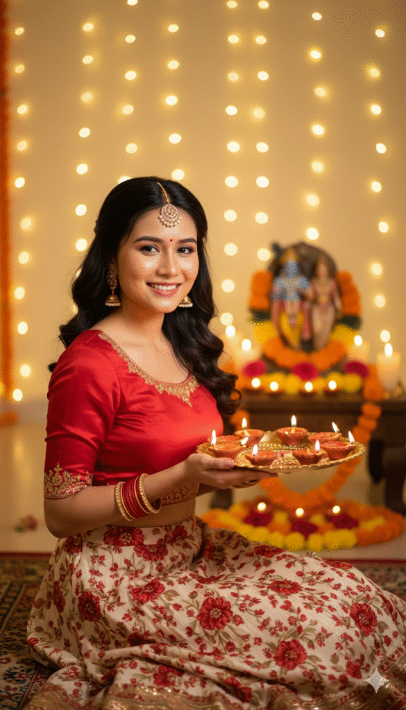 genrate image of me sitting gracefully during Diwali celebration, holding a decorated brass plate (diya thali) with lit oil lamps. She is wearing a traditional festive outfit — a red blouse with half sleeves and a long cream skirt with red floral patterns. She has traditional jewelry including a maang tikka, earrings, and bangles. Her hair is softly curled and draped over one shoulder.The background is warmly lit with numerous diyas and fairy lights creating a soft golden glow. There is a statue of Mata Laxmi in the background, surrounded by flowers and candles. The ambiance is festive, spiritual, and serene. The lighting should be warm, golden, and bokeh-style with shallow depth of field, highlighting her face and the diyas she holds. The mood should feel cinematic and radiant