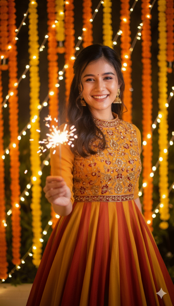 generate image of me holding a lit sparkler in her hand, smiling joyfully while posing during a festive night. She is wearing a traditional Anarkali dress with a flared pattern in warm golden-yellow and orange tones, featuring intricate embroidery around the neckline. Her wavy hair is partially tied back, and she is adorned with subtle festive jewelry like jhumkas (earrings). The background is beautifully decorated with warm yellow fairy lights forming diagonal patterns, and marigold garlands hanging from above. The atmosphere is warm, vibrant, and celebratory, typical of Diwali or an Indian festival night. The lighting highlights her face and sparkler, creating a glowing and magical effect.