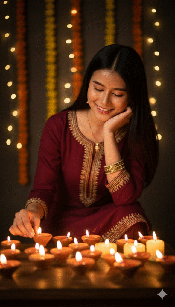 She has a gentle smile while looking down at the lamps, resting her chin lightly on one hand and adjusting a diya with the other. She is wearing a deep maroon traditional kurta with intricate golden embroidery, gold bangles, and a delicate necklace. Her long, straight black hair is open, softly reflecting the diya light.