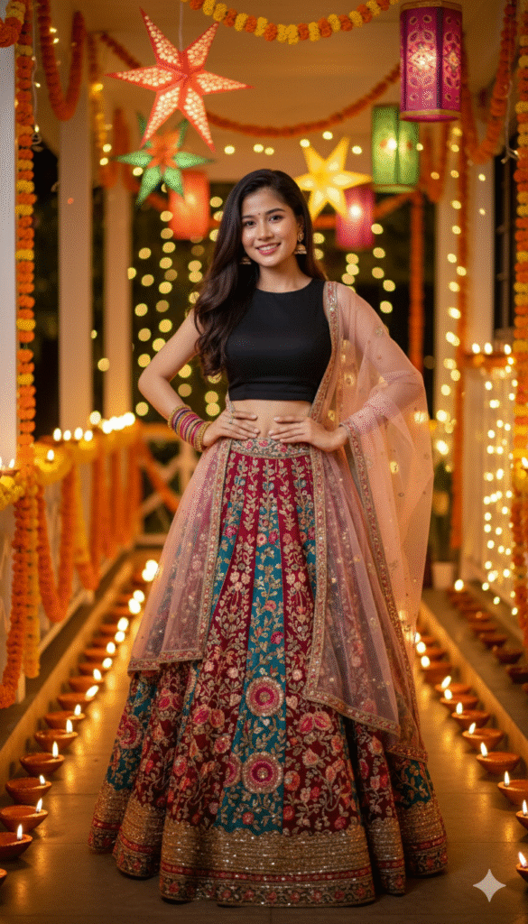 Ultra-realistic 8K DSLR festive portrait of the same young Indian woman. She is standing casually on the porch decorated for Diwali, wearing a stylish Indo-western lehenga fusion fusion outfit a sleeveless blouse paired with a flowy embroidered lehenga skirt, layered with a light net dupatta draped across her arms.Her Hairs Are Open Giving A Asthetic Festive Vibes. She accessorizes with delicate jhumikas and bangles. Her hands rests gently on her waist, smiling warmly at the camera. The porch walls and floor are glowing with rows of diyas marigold flowers, fairy lights, and colorful lanterns, casting cinematic golden tones. Background softly blurred with dreamy bokeh of light lamps, creating a festive Instagram-aesthetic portrait Professional DSLR framing. ultra-realistic 8K clarity