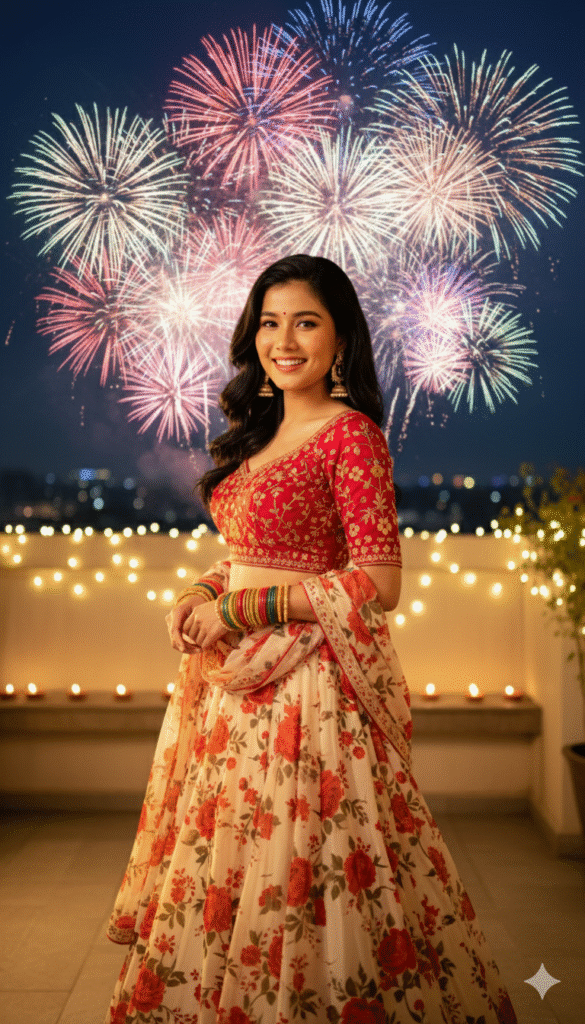 Ultra-realistic 8K DSLR festive portrait of me in open silky aesthetic hairs. She is wearing the same red stylish blouse and cream lehenga with red floral prints with cream dupatta, adorned with bangles and earrings. She is standing gracefully on a festive terrace, her eyes glowing with joy as she smiles at the camera. The background glows with fireworks in the sky, fairy lights on the walls, and diyas placed along the ledge. Cinematic shallow depth of field, warm golden festive tones, professional DSLR sharpness.