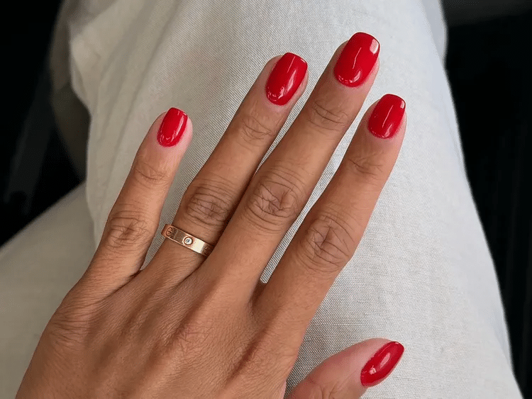 Sometimes the simplest ideas are the best. Square-shaped nails coated in glossy red polish are always fashionable. They look neat, balanced, and never go out of style.