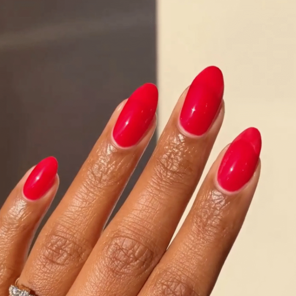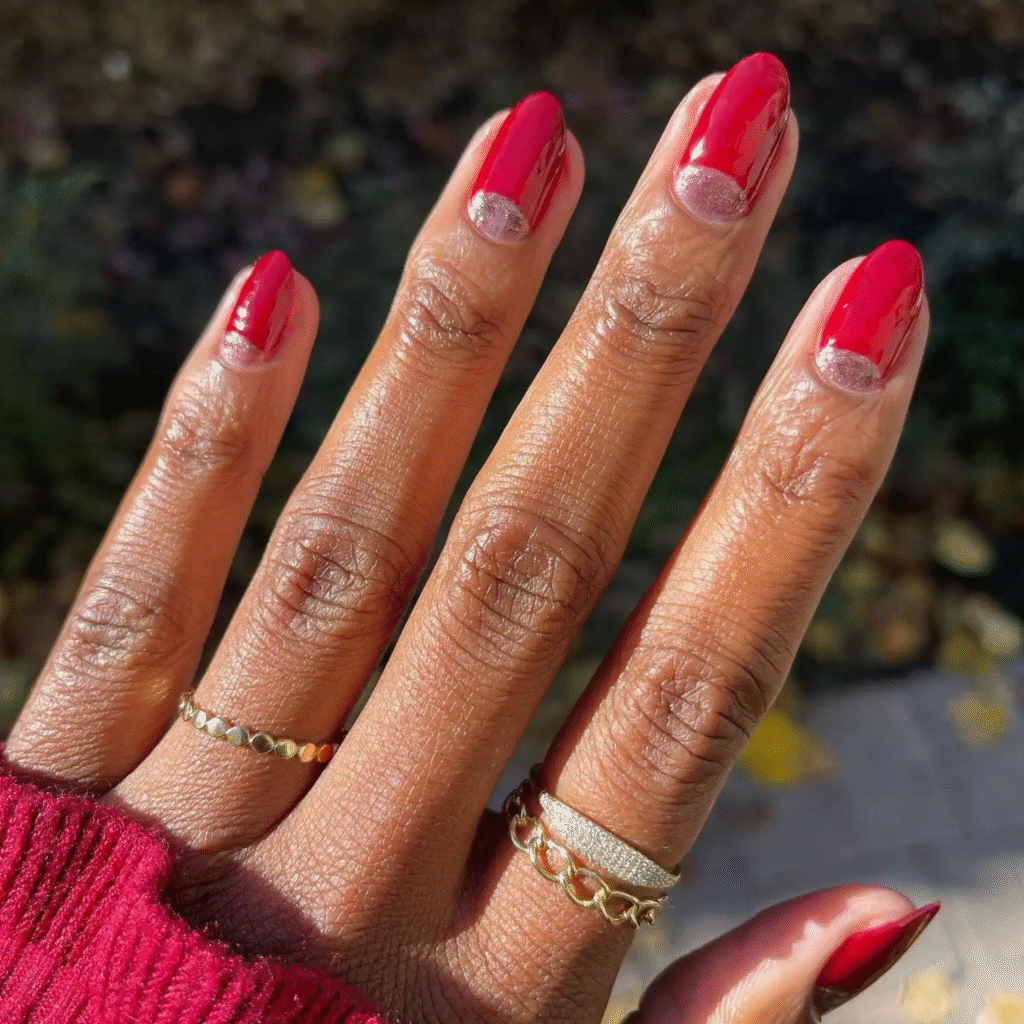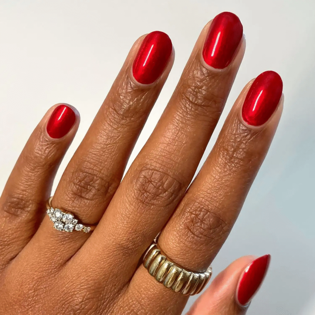Want something timeless? This red manicure has a subtle bronze shimmer that glows in the light. It’s classy, warm, and ideal for everyday wear during the colder months.