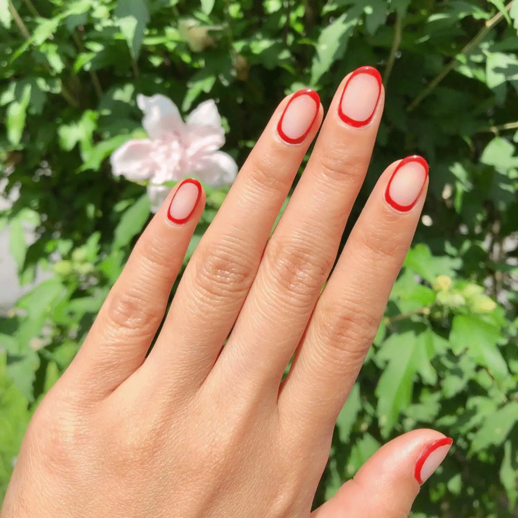 If you love clean and minimal looks, this one’s for you. Red outlines around bare nails give a fresh, modern feel. It’s simple but creative — like little apples floating on your fingertips.