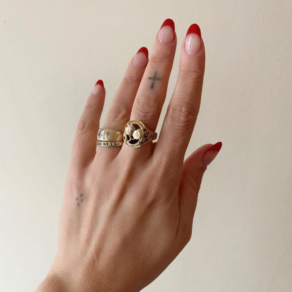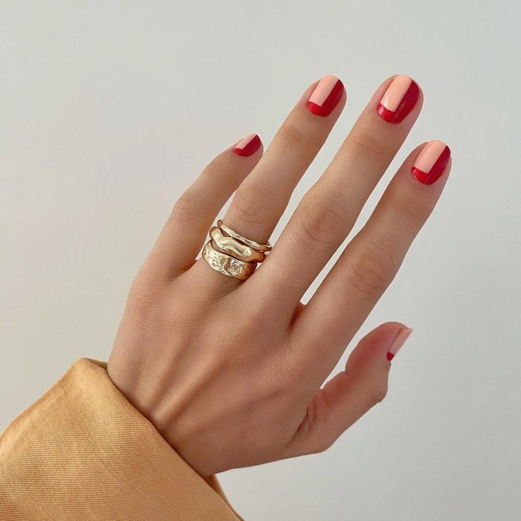 This French manicure extends the red tips deeper toward the base, giving a dramatic and trendy twist. It’s bold but still simple. If you like something striking yet refined, this is it.