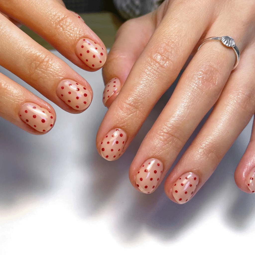 Tiny red dots on a nude or white base make this design cute and nostalgic. It’s simple but eye-catching, giving a playful twist to classic nails. A perfect choice if you like fun patterns.