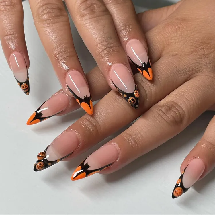 Go bold with black French tips and nude nails. Add small 3D pumpkins and tiny bats for a dark, spooky touch. The sharp stiletto shape makes the design even more dramatic.