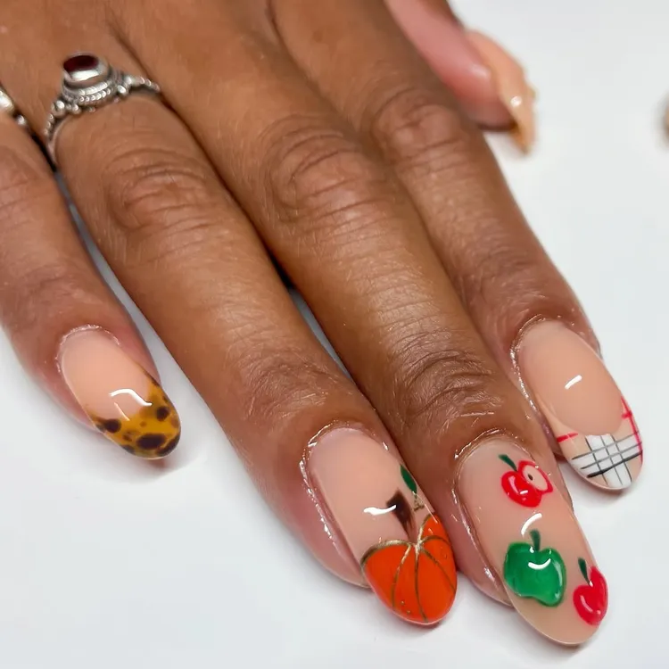 This design mixes everything you love about fall. Add pumpkin tips, apple art, plaid prints, and tortoiseshell accents. It’s like wearing the whole autumn season on your nails.