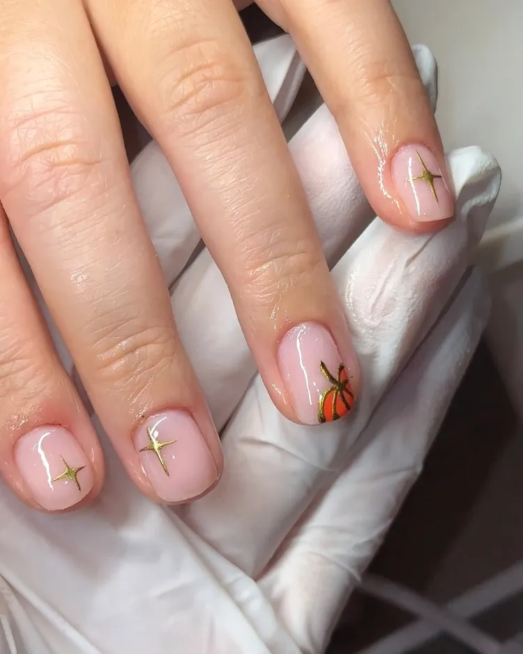 Keep it minimal with nude nails and a small pumpkin accent. Add a touch of gold sparkle for charm. These short, clean nails are simple yet festive.