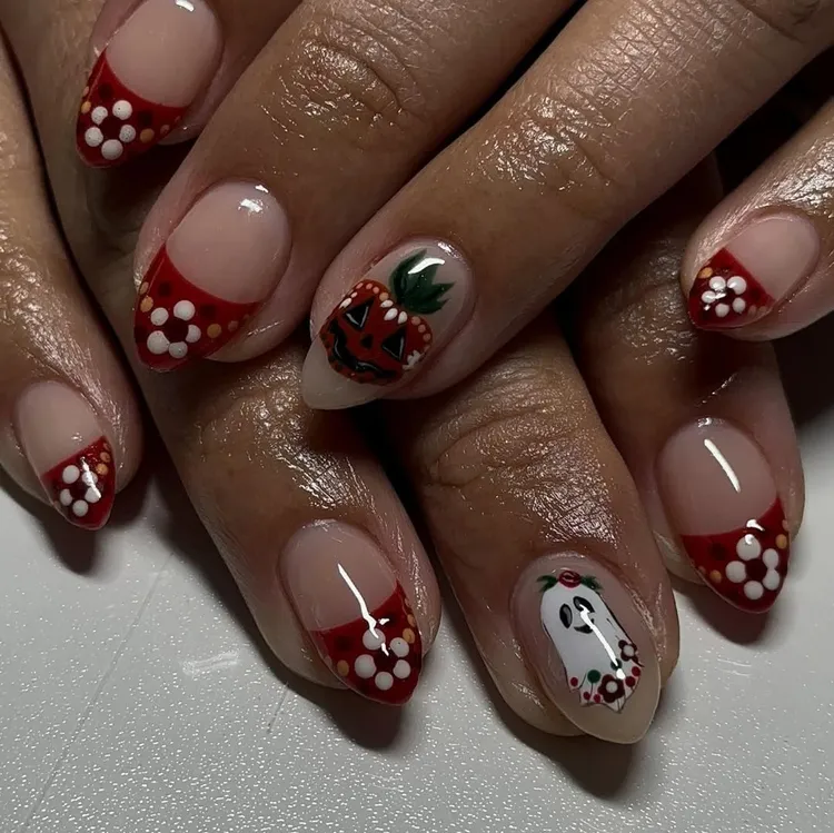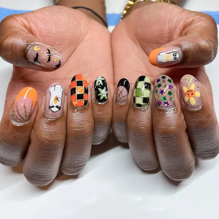If you love variety, go for a mix-and-match design. Paint each nail differently with pumpkins, ghosts wearing sunglasses, and checker prints. It’s playful and gives a full Halloween feel.