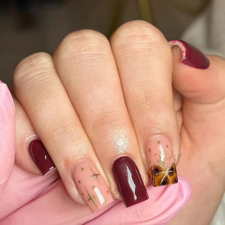 Tortoiseshell nails are perfect for fall. Mix burgundy and nude tones, then add gold chrome pumpkins. It’s neutral, classy, and goes well with any outfit.