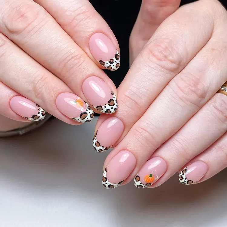 If you’re going for a bold Halloween outfit, add leopard-print tips to your nails. Paint pumpkins on the ring finger for a stylish wild look. It’s a fun and fierce design for the season.