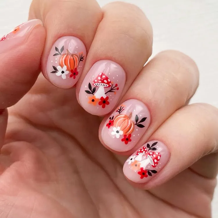 These nails look like something from a storybook. Paint small pumpkins, mushrooms, and flowers in warm colors. The soft hand-painted details give a cozy and magical fall feeling.