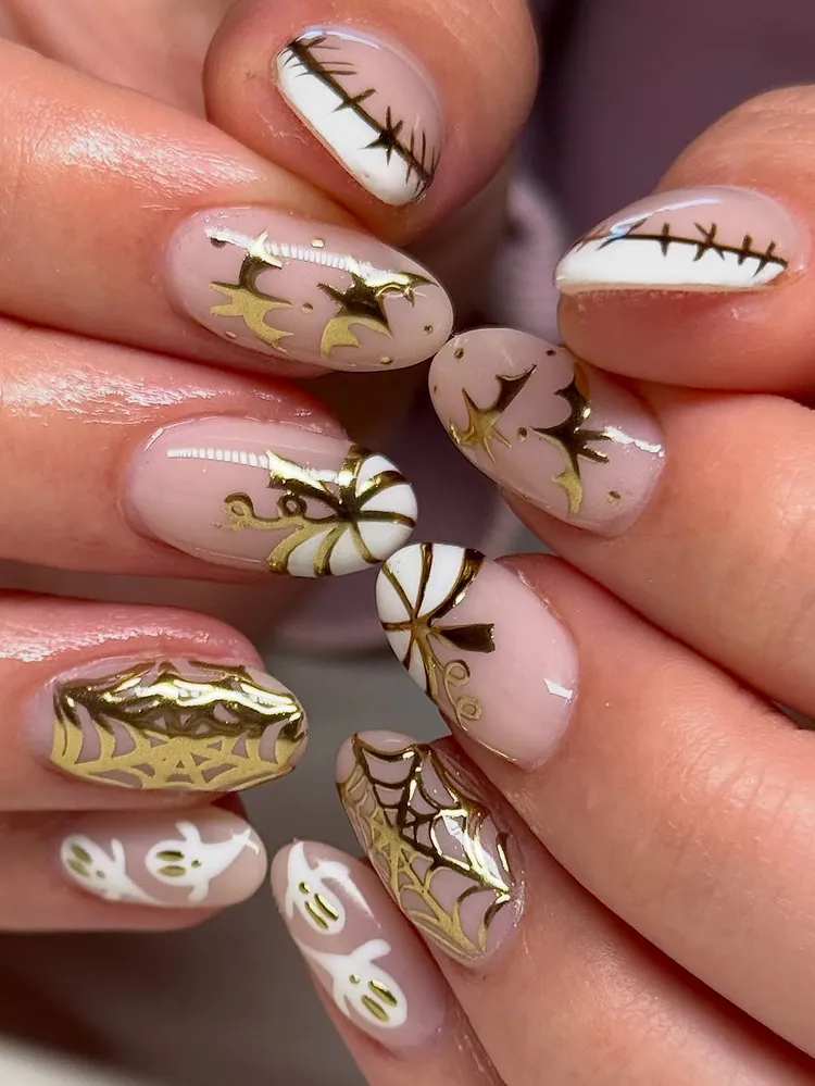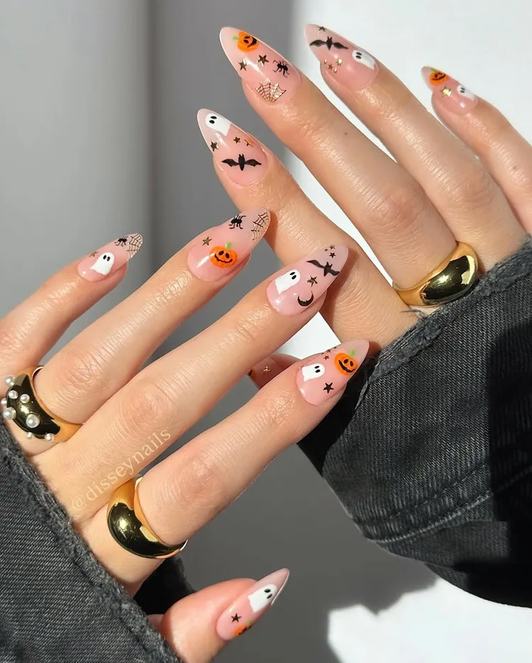 This design is perfect if you love cute details. Paint your nails with a nude base and add small pumpkins, bats, and spiders. It’s simple and reminds you of the sticker books from childhood.