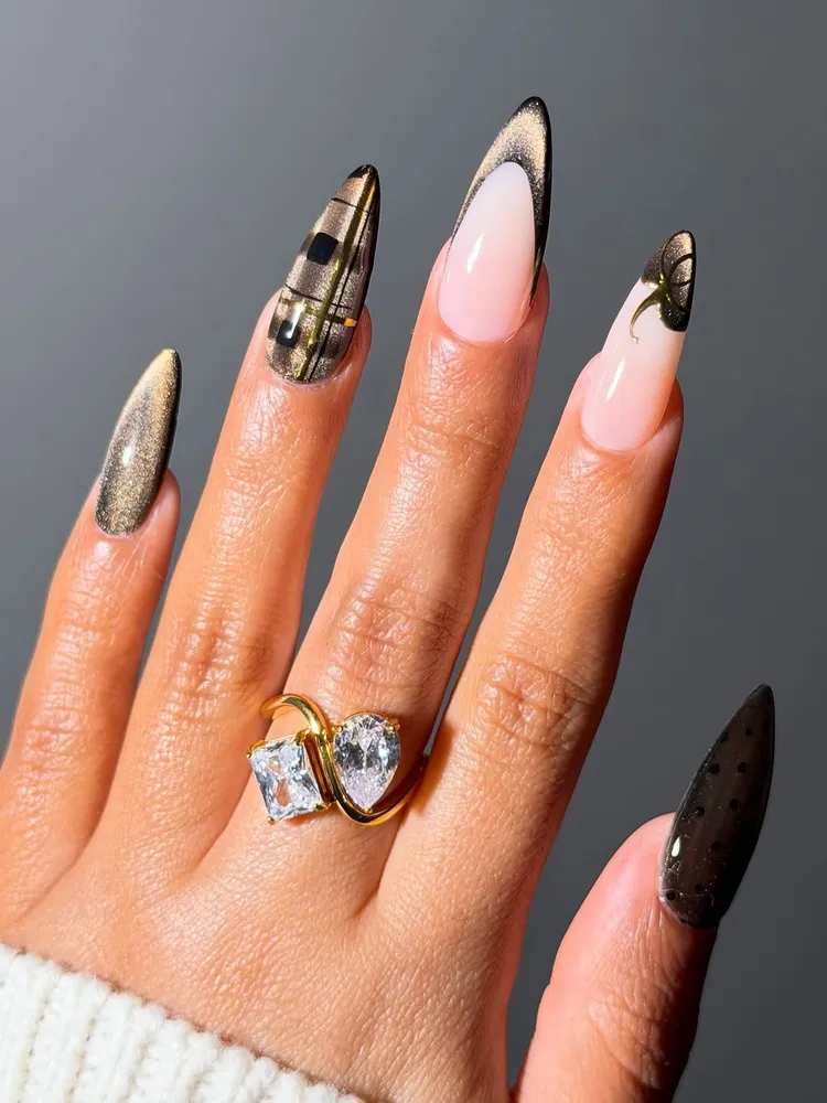 For a more glamorous look, choose black and gold cat-eye polish. Add shiny pumpkins, plaid prints, and long almond nails. This look gives Halloween a stylish, rich twist.