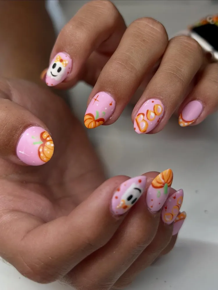 If you like something cute instead of scary, try pink Halloween nails. Add pumpkin French tips and tiny ghosts with bows. Use a matte finish for a soft, trendy look that feels modern and fun.