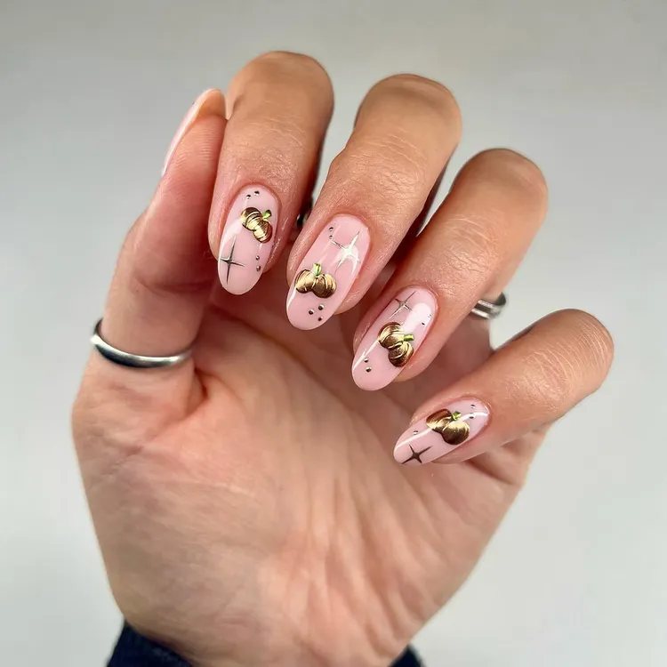 Go for a soft pink or nude base and add chrome pumpkins for a classy twist. This mix of warm and shiny tones gives a rich, elegant vibe. It’s a perfect pick for those who love subtle beauty.