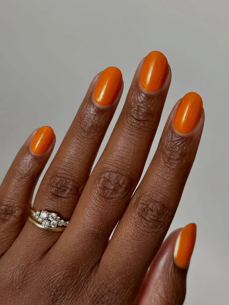 Keep it classic with pumpkin-orange nails. Add a little gold sparkle to give the glow of a jack-o’-lantern. This look works great with short, rounded nails that are simple and easy to wear.
