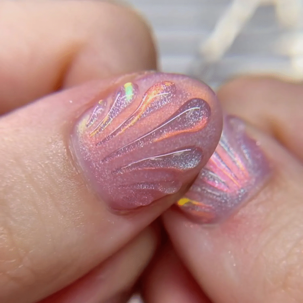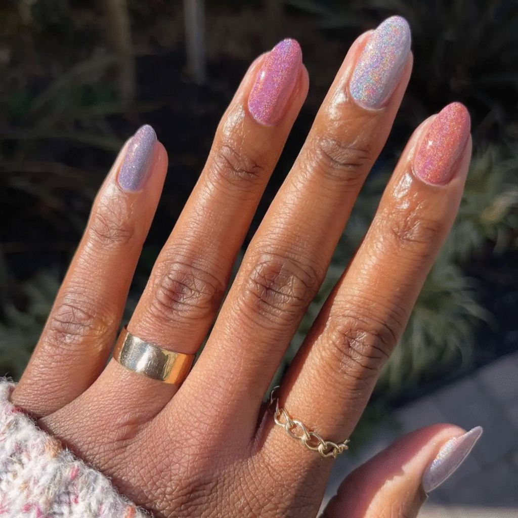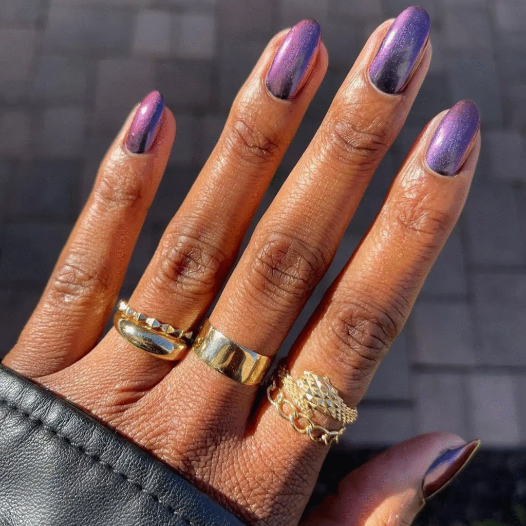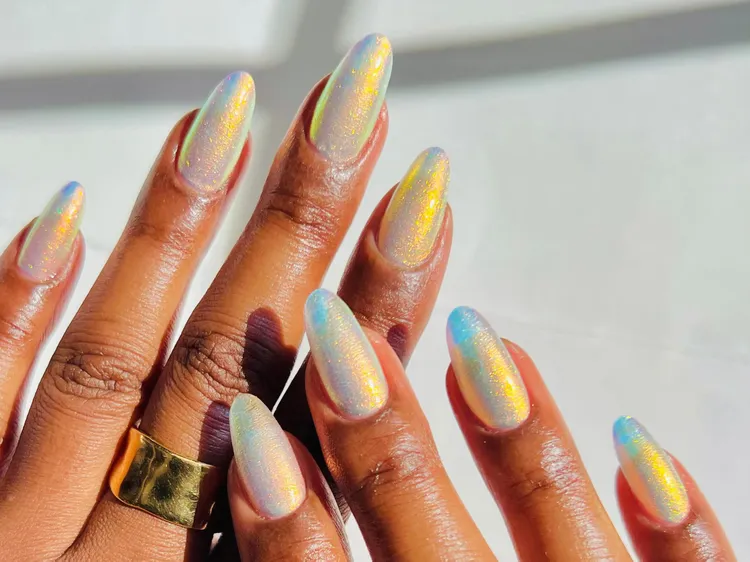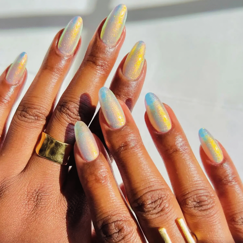 Capture the beauty of a sunset with an opal-inspired design. This shimmering, iridescent manicure has a warm, shifting glow that mimics the setting sun. The key to this look is finding the right shade-shifting polish to create the perfect effect.