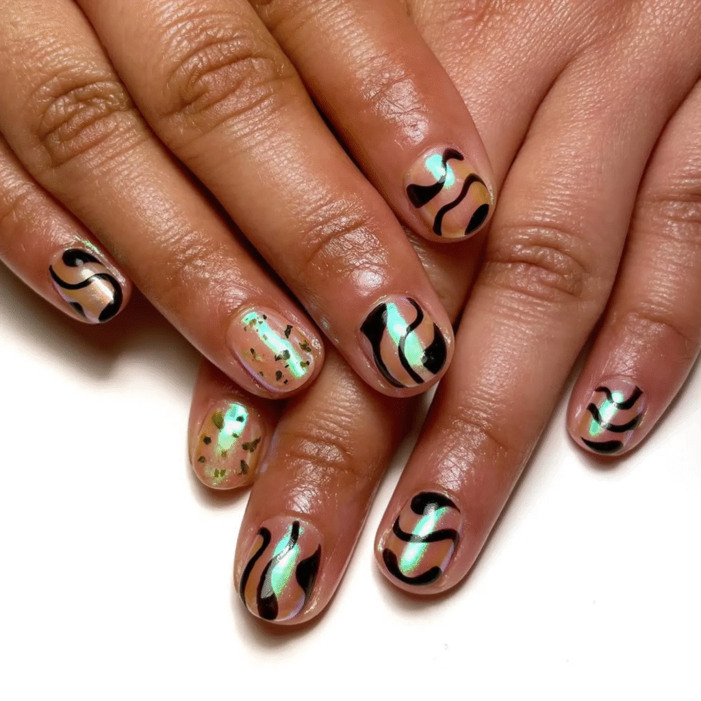 Opals are known for their milky, iridescent look. They can change color and have a holographic quality that makes them stand out. One way to wear opal on your nails is with a sheer chrome wash. Add black swirls and dots on top to create a unique and striking contrast.