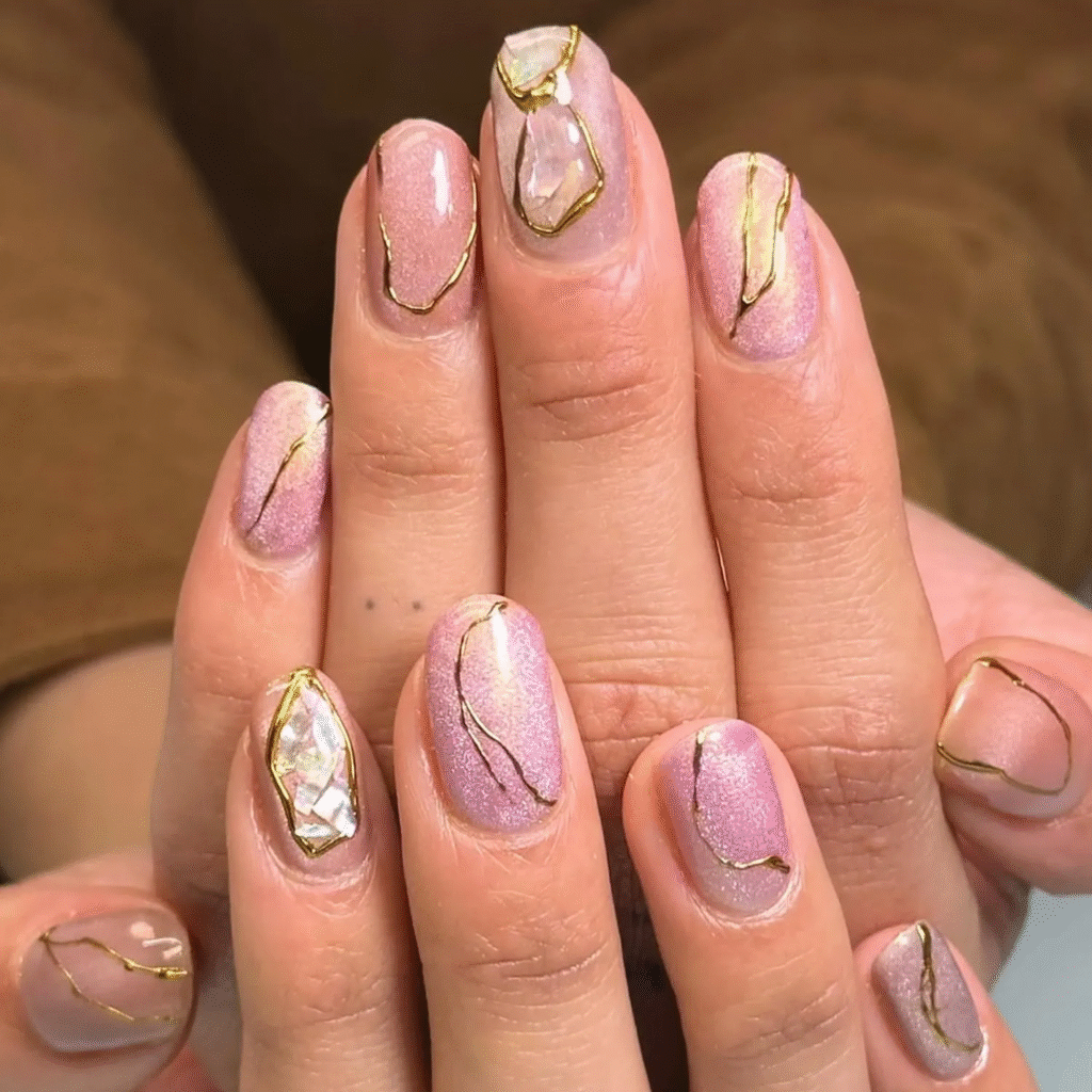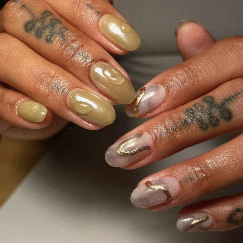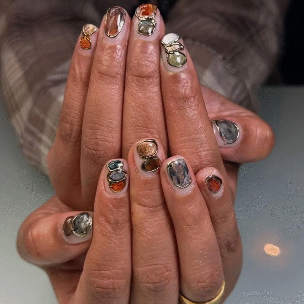 Opal and tourmaline both come in a variety of colors, so why not mix them? A combination of velvet-metallic marbled splotches on your nails can create an abstract and earthy vibe. Highlight them with a 3D chrome outline for extra flair.