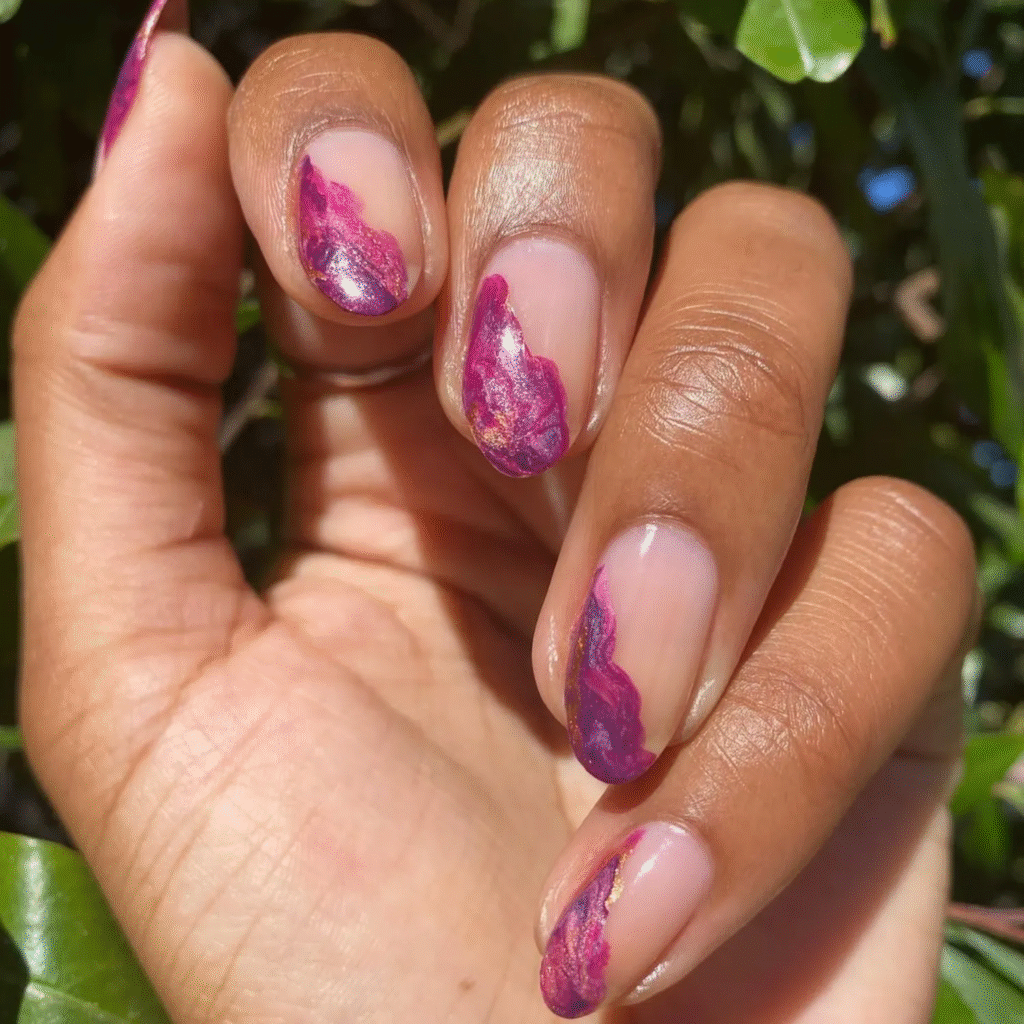 Want something a little bolder? Try a diagonal marbled design with a mix of berry colors and a glossy finish. The shade-shifting swirls add a beautiful touch to your nails, making this design a great tribute to the October birthstone.