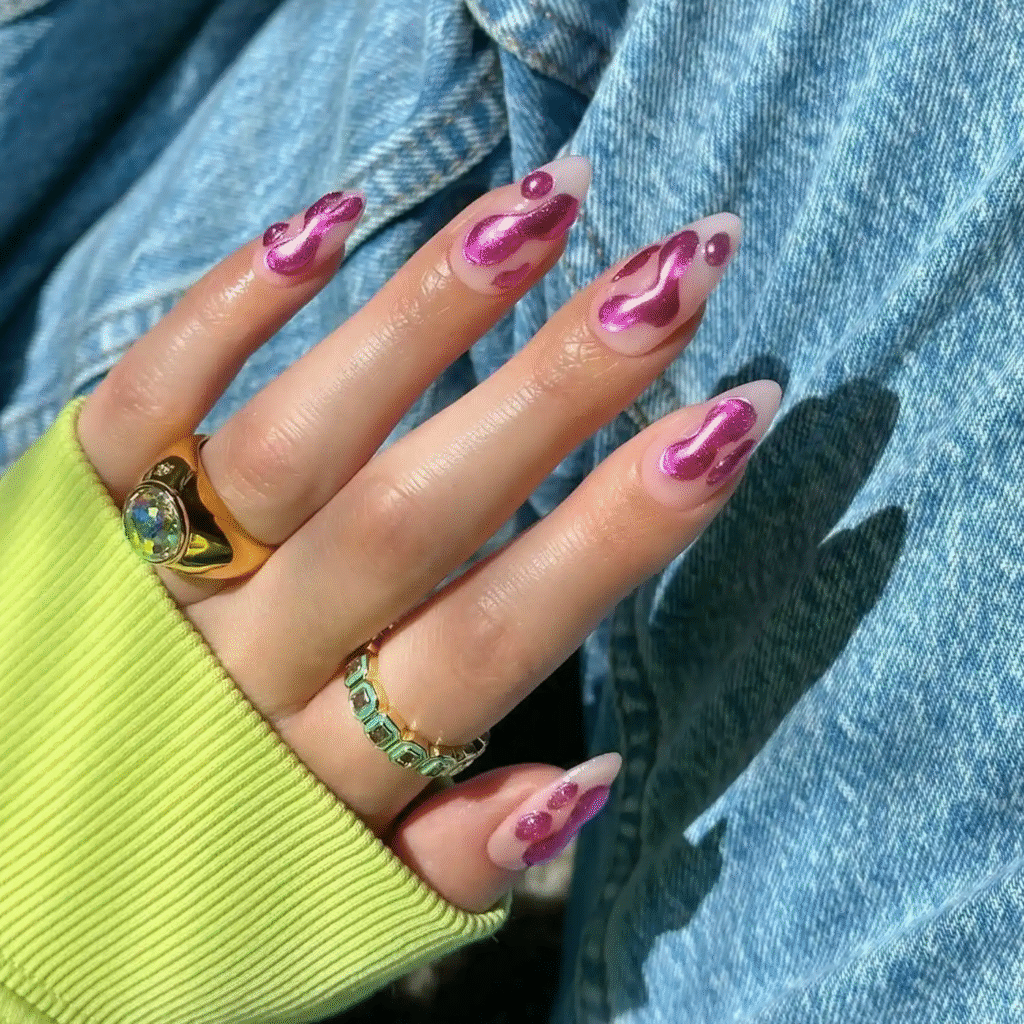 For a more vibrant design, try a hot pink lava lamp look. This bold, 3D design captures the essence of tourmaline with a vibrant twist. It could also be created with iridescent or holographic shades for an opal-inspired effect.