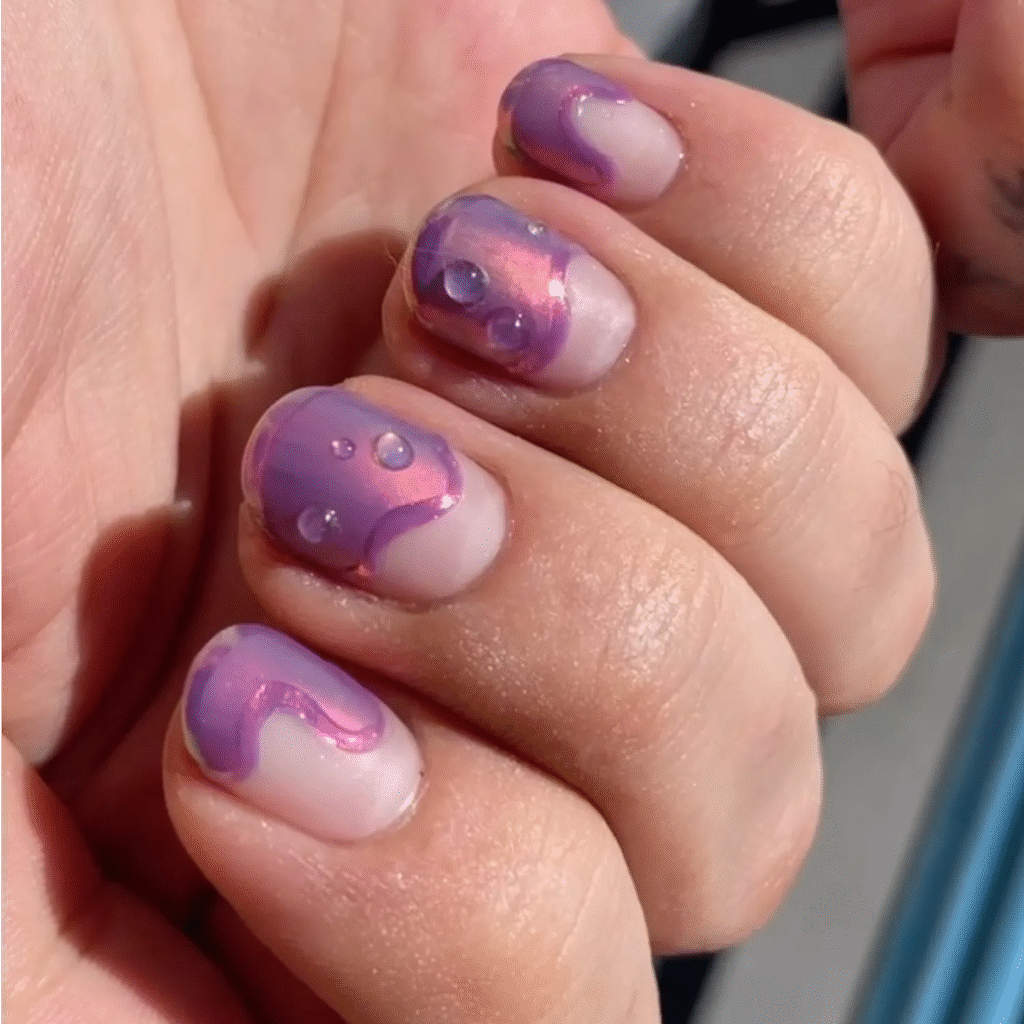 This design features iridescent hues of siberite and rubellite. Clear builder gel along the tips and waves gives it a beautiful dewdrop effect. It’s simple yet eye-catching, perfect for adding a unique touch to your nails.