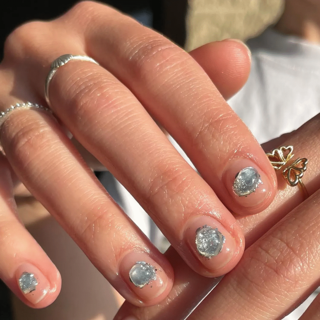 This minimalistic design features iridescent orbs in the center of each nail. Imagine swapping the orbs for opal-inspired polish to create a magical effect. It’s a minimalist design with a touch of opal magic.