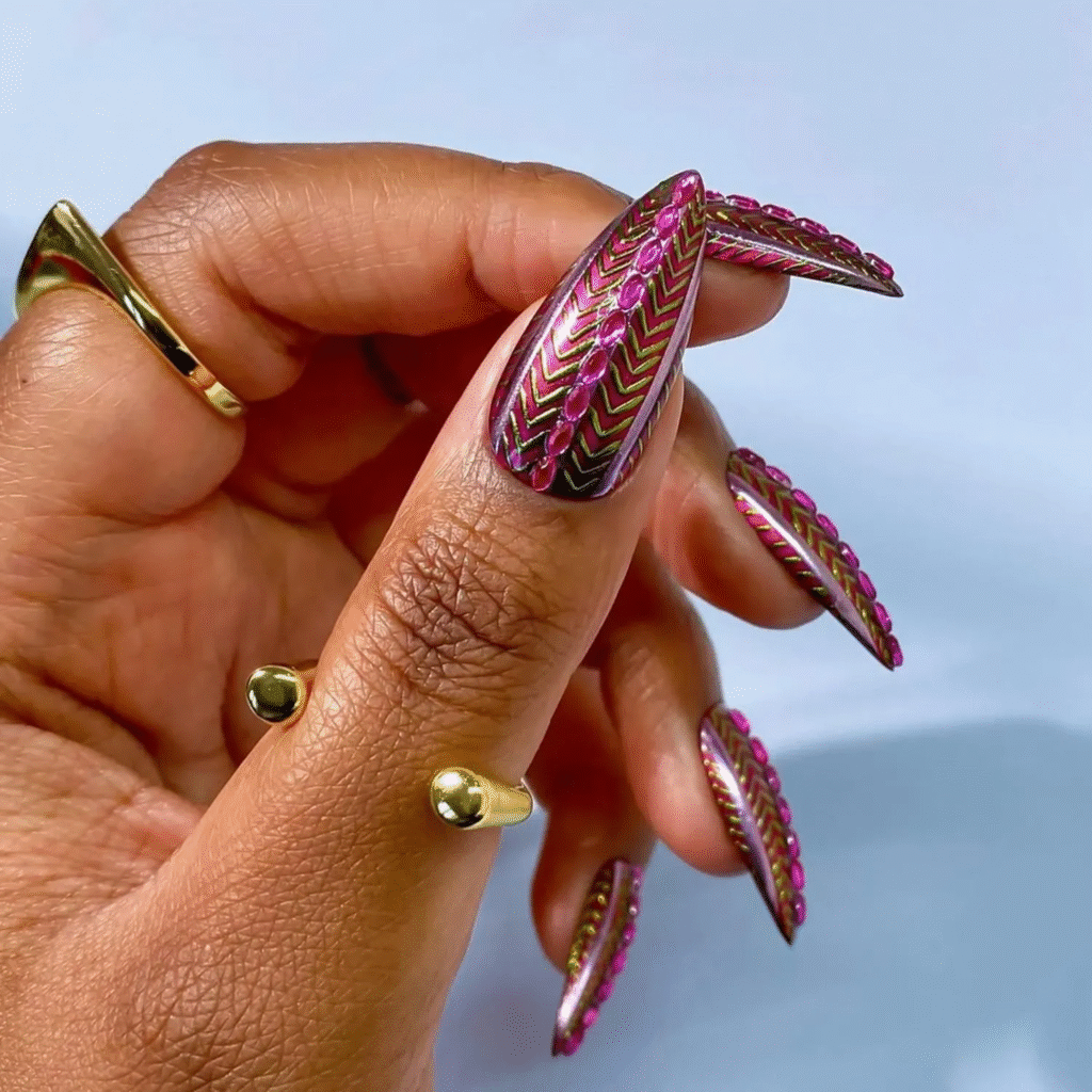 Tourmaline comes in several colors, but pink tourmaline is particularly popular. It has a rich, berry tone that makes it a great choice for a metallic nail look. This design brings out the beauty of tourmaline, with a metallic finish that captures the gem’s radiant color beautifully.