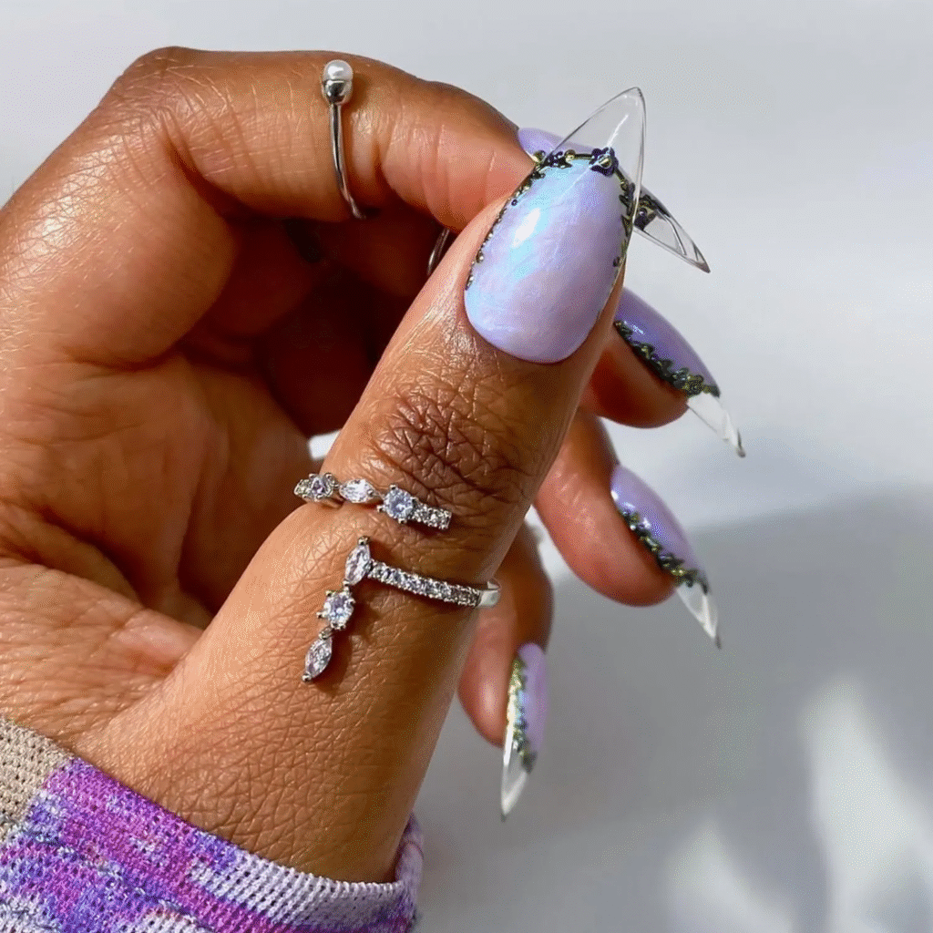 For a unique twist on the classic French manicure, try this iridescent lavender design. The clear gel tips add a modern and futuristic feel, giving the nails a shiny, opalescent glow.