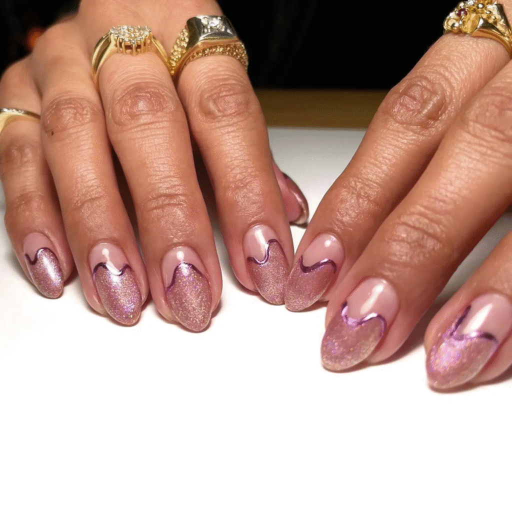 Lastly, for a cute and playful design, try these pink and gold heartbeat nails. The relaxed wave pattern on the nails gives it a charming vibe, making it a fun way to show off your love for tourmaline.