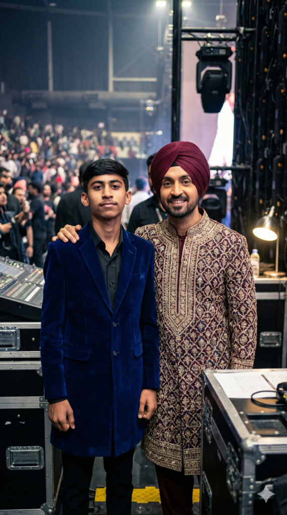 Copy This Prompt: Ultra-realistic professional DSLR photograph. A candid vertical portrait of ME standing next to Punjabi singer Diljit Dosanjh backstage at a luxury concert venue. We are posing together naturally like close friends.