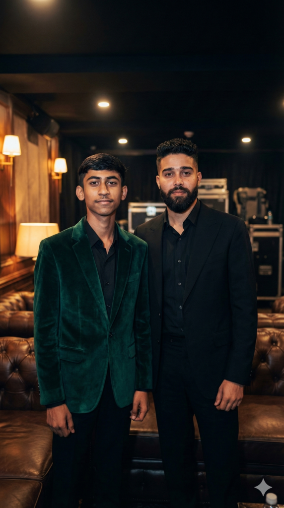 Copy This Prompt: Ultra-realistic professional DSLR photograph. A candid vertical portrait of ME standing next to Punjabi singer AP Dhillon in a premium concert backstage lounge.