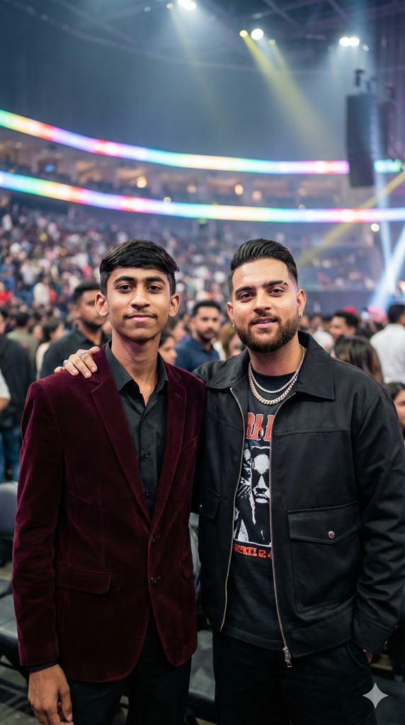 Copy This Prompt: Ultra-realistic professional DSLR photograph. A candid vertical portrait of ME standing next to Punjabi singer Sidhu Moosewala inside a modern open concert arena. We are posing together naturally like close friends.