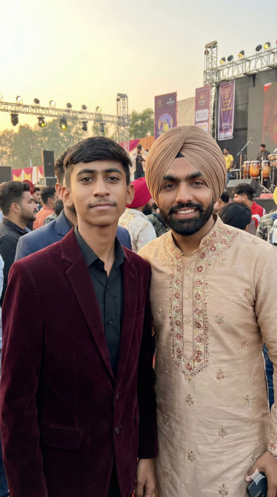 Copy This Prompt: Ultra-realistic professional DSLR photograph. A candid vertical portrait of ME standing next to Punjabi singer Ammy Virk in a cultural concert setting.