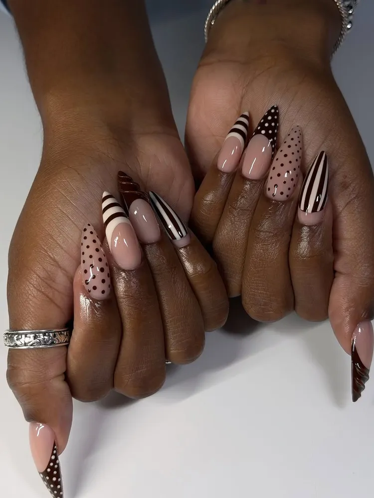 This manicure mixes many prints like brown dots, stripes, and French tips. Clear gel details make the design look detailed and unique.