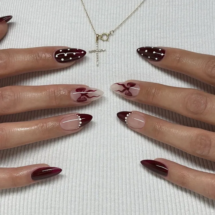 This style uses cranberry red nails with white dots and cute bow accents. It is a classic holiday look that never goes out of style.