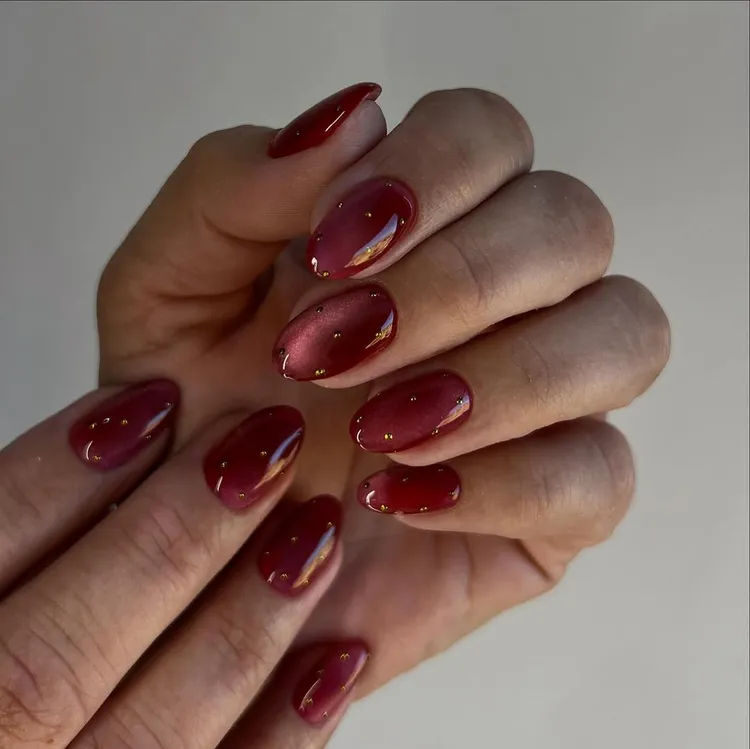 These red velvet nails look rich and shiny, and the tiny gold dots make them stand out. This style is perfect for holiday parties because it looks warm and festive.