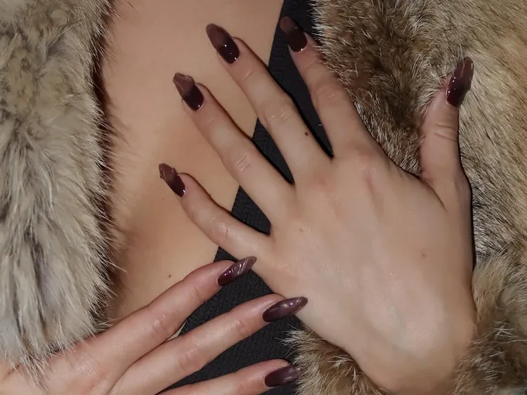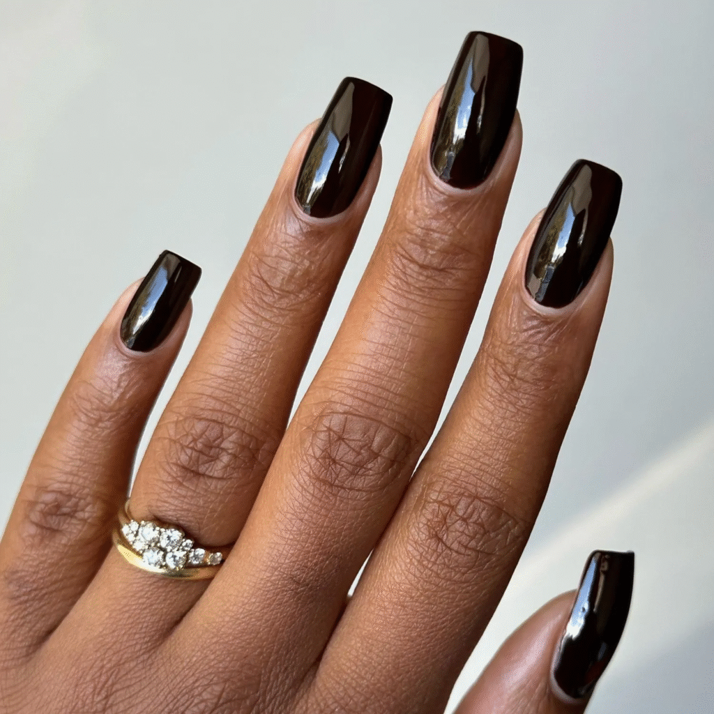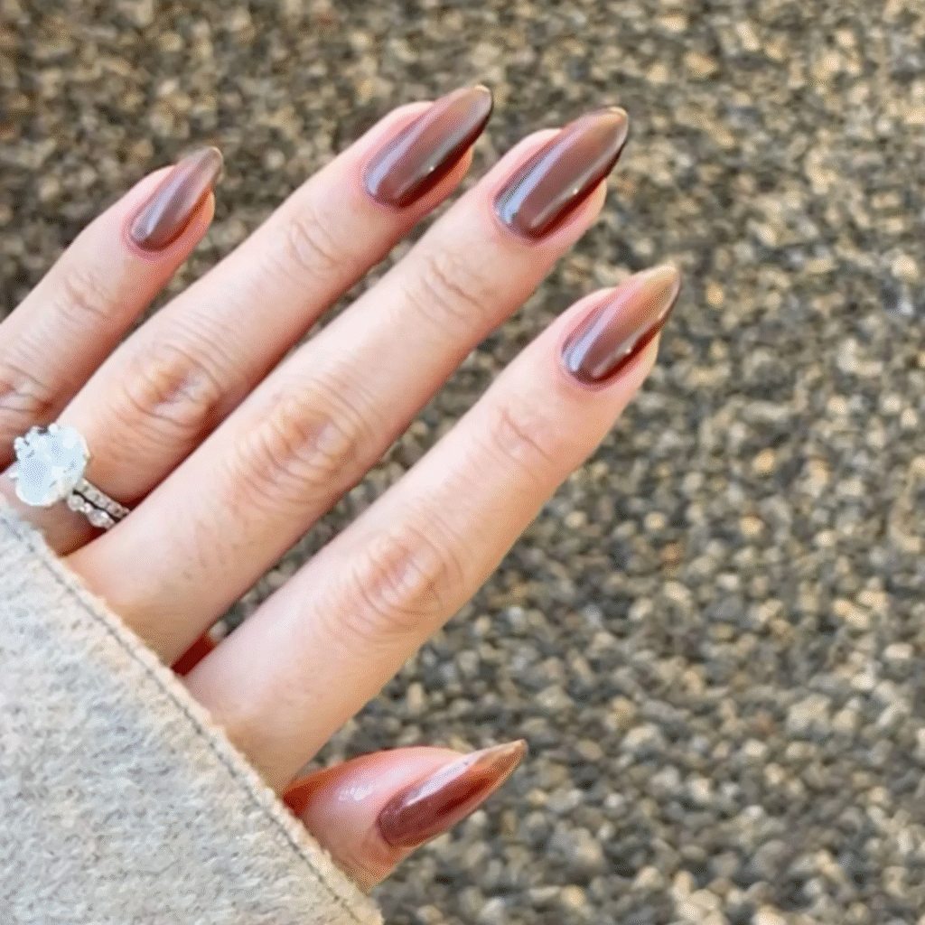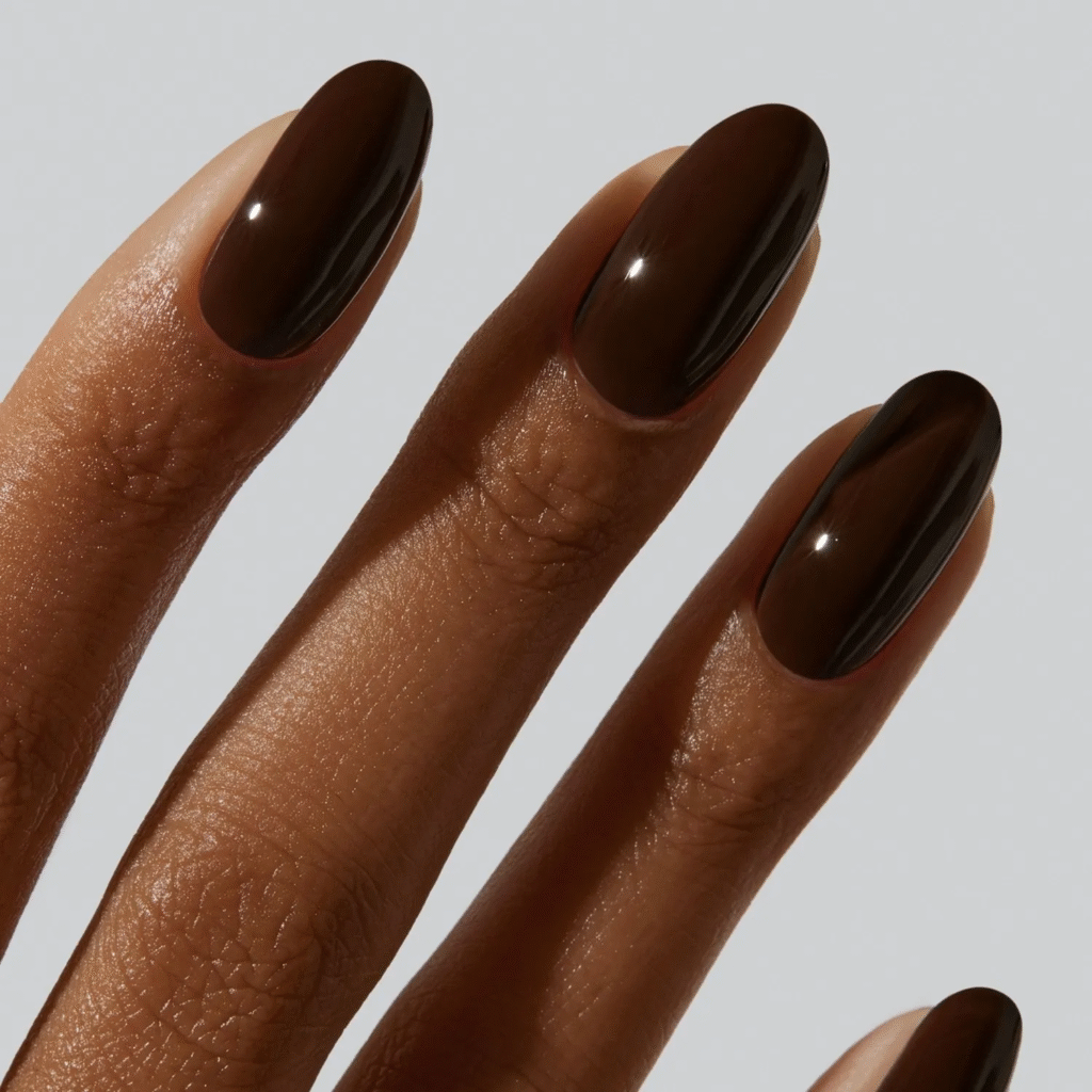 As the temperatures drop, try swapping your usual neutral shades for deeper tones like dark toffee. This rich brown gel polish works perfectly with all your fall outfits, bringing a warm and elegant touch to your nails.