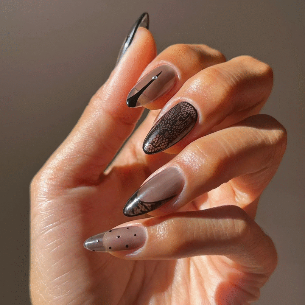 Want to add some sophistication to your look? Try sheer lace gel nails. You can use fine nail art brushes or stickers to create delicate lace designs over sheer black polish. It’s an elegant way to incorporate some fancy detail into your nails.