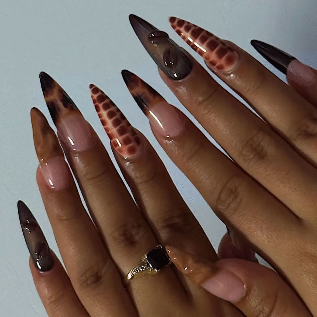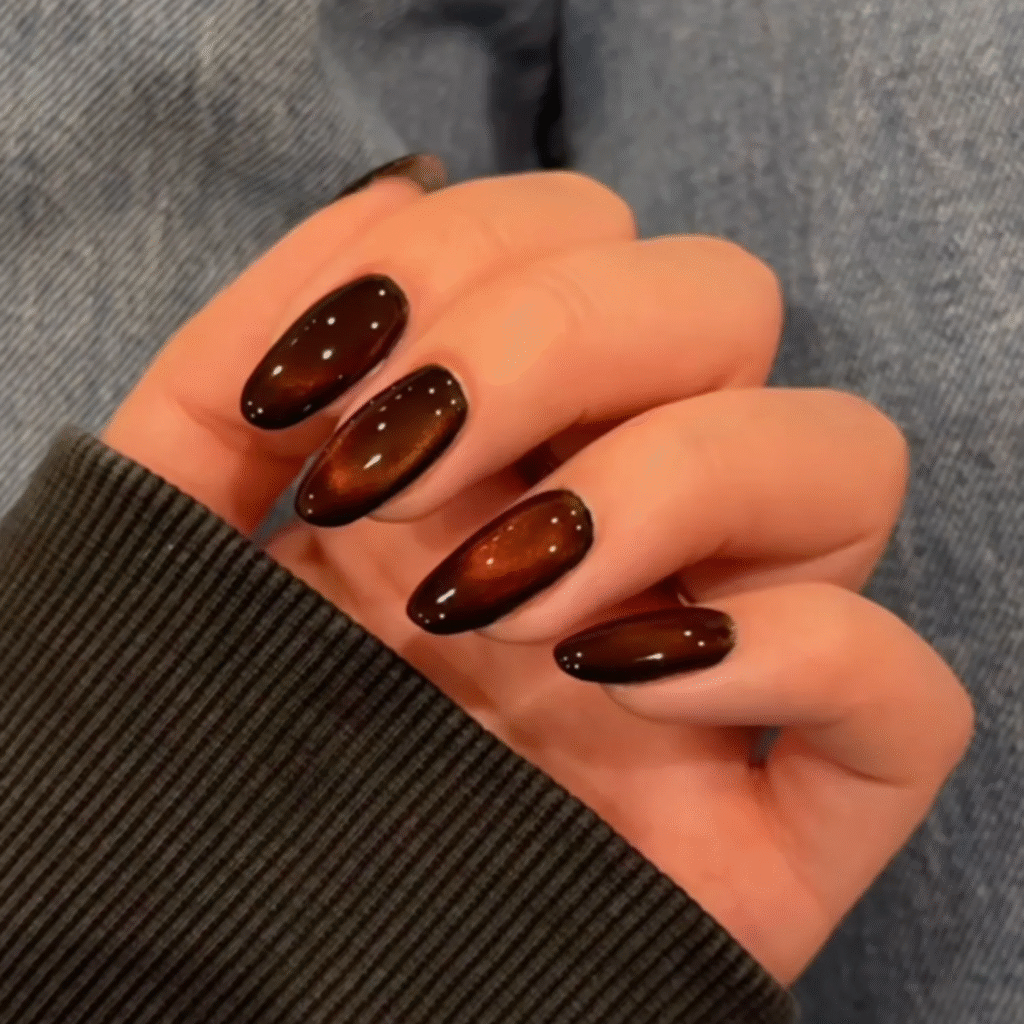 Caramel velvet glass nails are as luxurious as they sound. Start with a black base, then add silver magnetic polish and top it off with medium-tone brown polish. This layered effect gives the nails depth and a warm, velvety finish—perfect for the season.