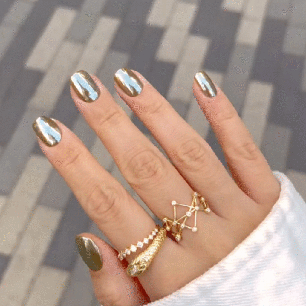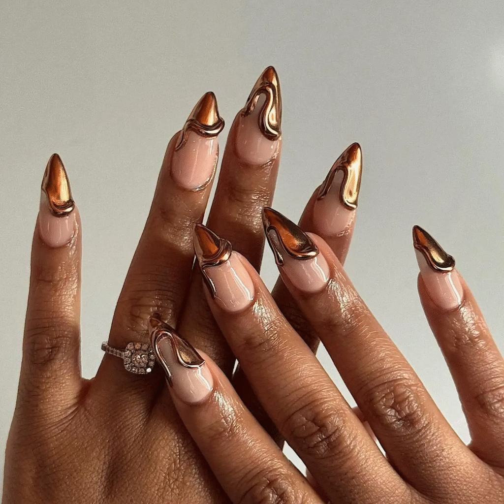 If you’re still loving the metallic chrome trend, bronze chrome nails are a perfect fall pick. This coppery metallic polish brings together both the cozy autumn feel and the shine of futuristic designs. It’s the best of both worlds!